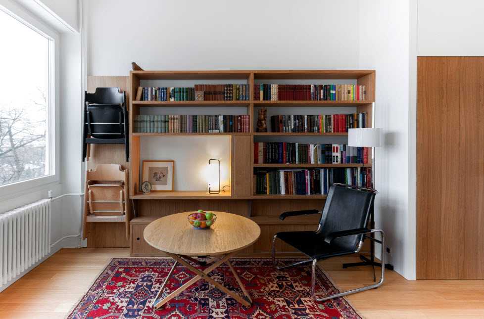 - минимум мебели: сочетание полок, выполненных из натурального дерева, металлических стеллажей, дивана и кресел, обитых искусственной кожей.