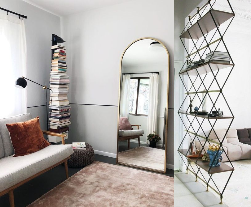 Пространство можно вытянуть по вертикали и другими доступными средствами. Подойдет тот же стеллаж от пола до потолка, высокое напольное зеркало, вертикальная книжная полка.
