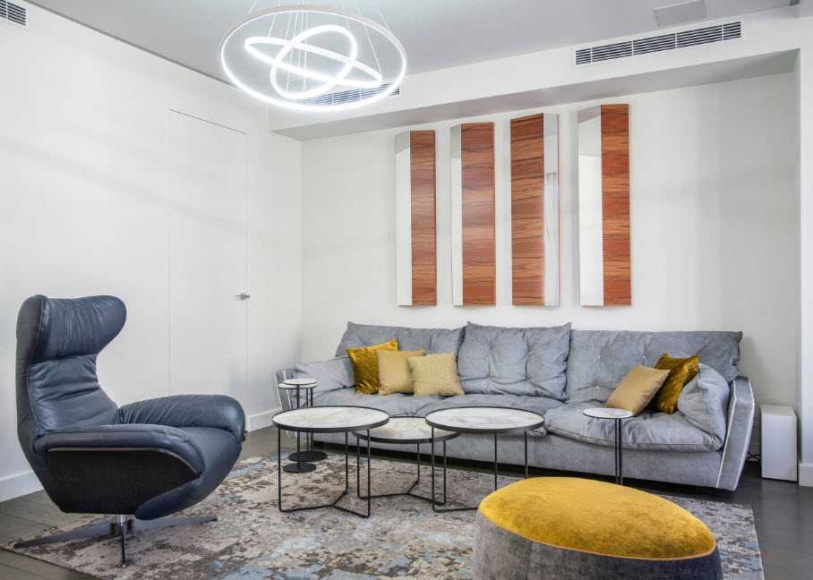 Без сомнения, гостям понравится гостиная с угловатой мебелью правильной формы и расставленными тут и там круглыми пуфами, элементами приятного отдыха и расслабления.
