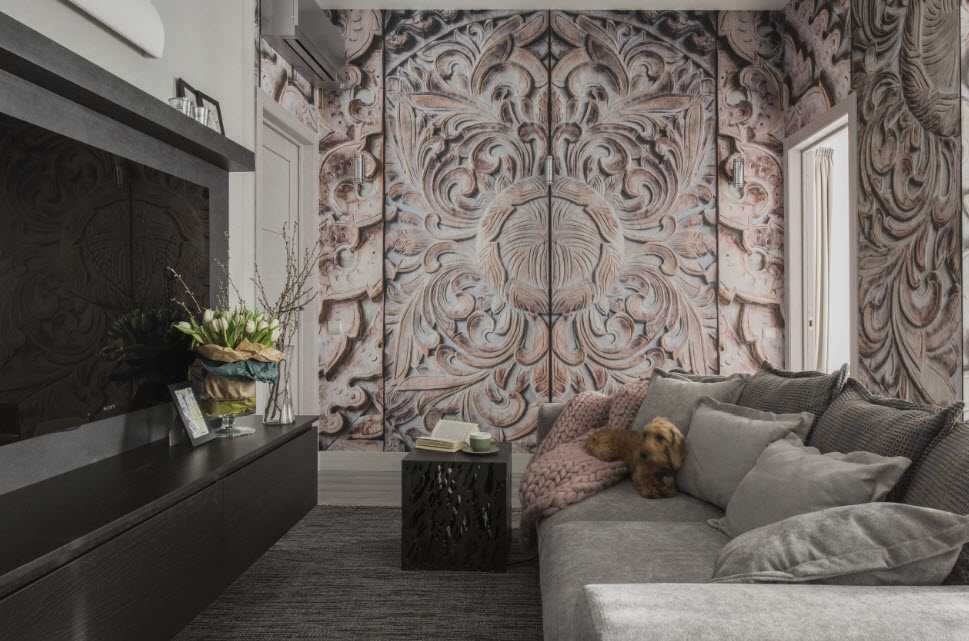 С помощью отделки вполне реально скорректировать геометрию пространства. Например, в узкой комнате одну из коротких стен попробуй оформить темным цветом – тогда она зрительно приблизится, и комната приобретет квадратную форму. Также хорошим вариантом выступят горизонтальные узоры на стене, которые «расширят» маленькую гостиную.