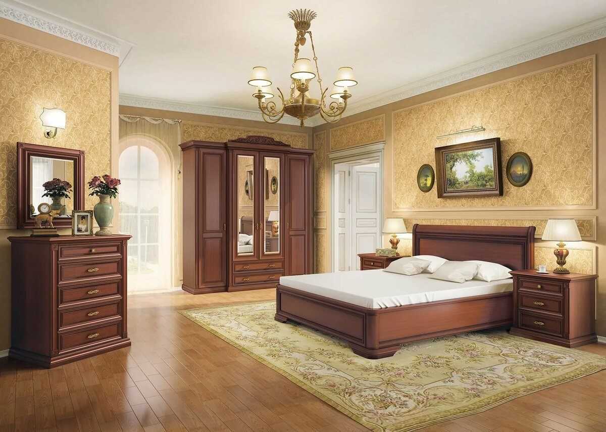 На любом фото спальни в классическом стиле можно видеть стандартный набор мебели, входящей в спальный гарнитур: