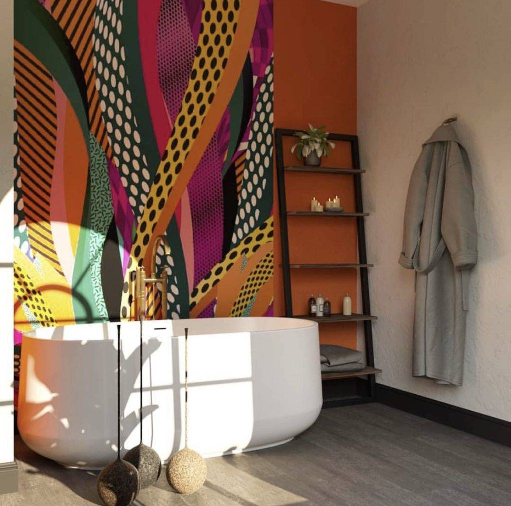 Геометрические элементы в отделке ванной комнаты – тренды этого года. Их выкладывают из плитки, подбирают обои с таким орнаментом. При правильном применении помогают визуально скорректировать размеры комнаты. В больших помещениях применяют геометрию по всем стенам. В маленьких выделяют одну или две стены.