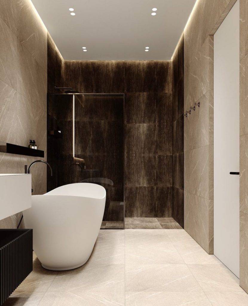 Комбинацией разных по яркости тонов в разных пропорциях можно реализовать ванную комнату любого современного стиля: