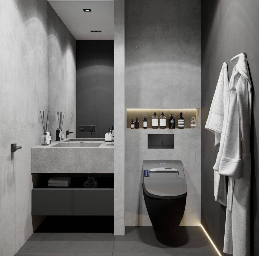 - Более тёмные цвета и имитация бетона — лофт ванная.