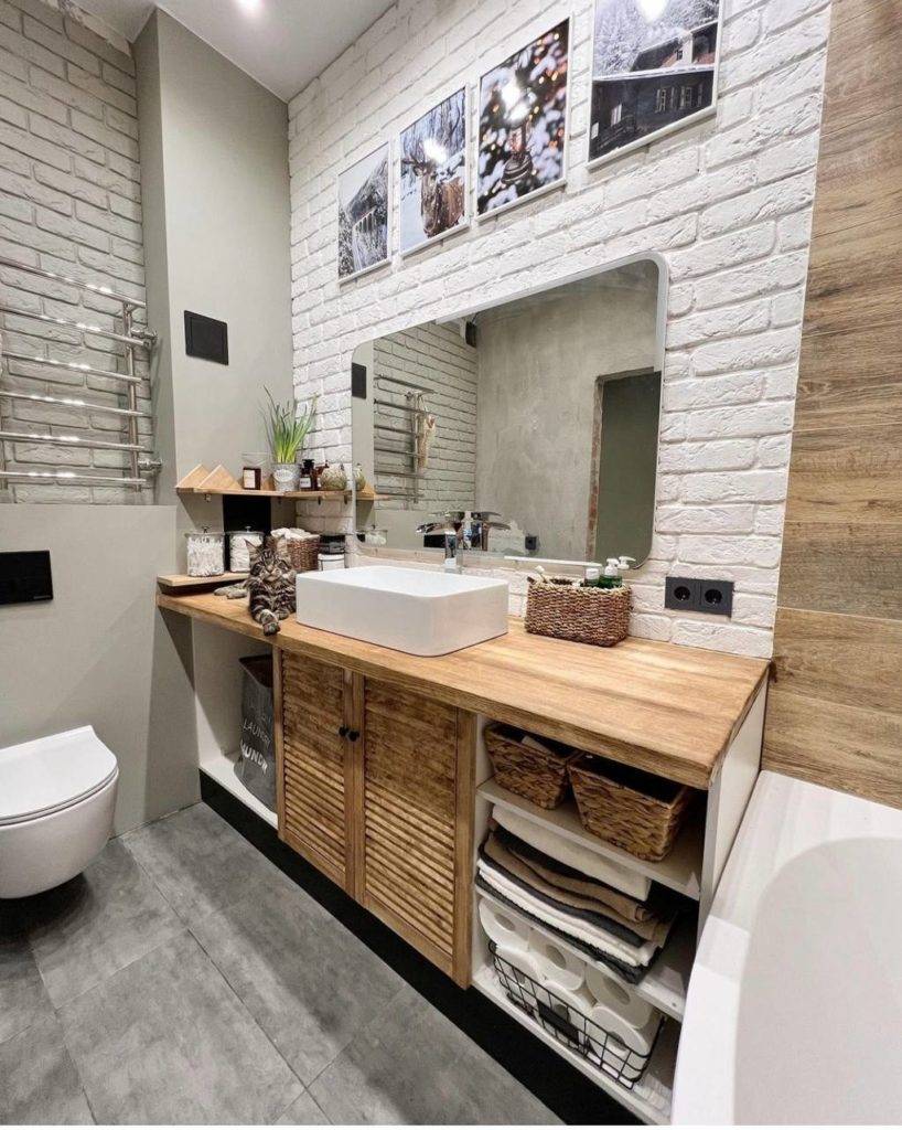 Апофеоз всего 2-ого раздела — серый цвет и дерево. Этих 2-ух компонентов уже достаточно для красивого дизайна ванной. И дело не в цвете, а в фактуре. Прожилки, сучки и запилы на качественном керамограните под дерево. Шероховатость и неровность бесконечного числа видов серой плитки под бетон и камень.