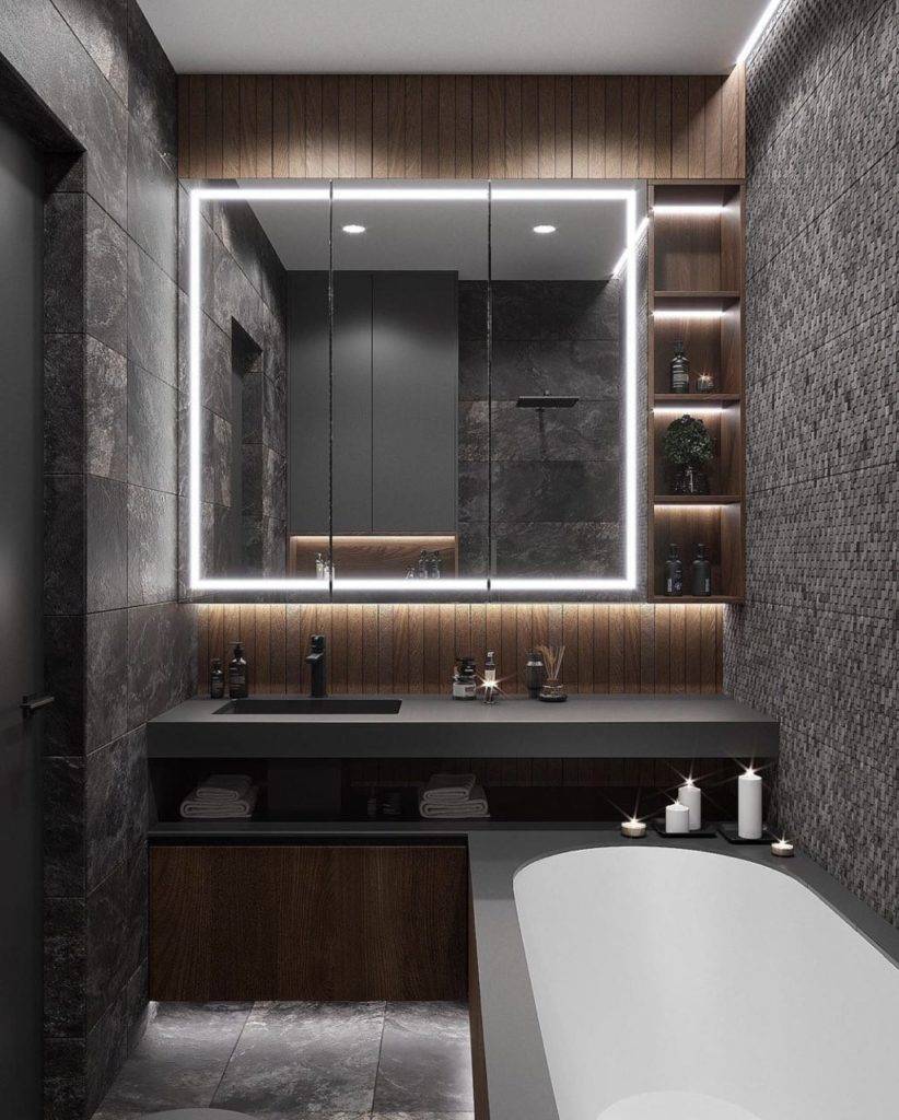 Черная сантехника очень стильная и модная. В качестве акцентов используй зеркала и подсветки. Можешь подсветить не только зону у умывальника, но и ниши, мебель, полки.