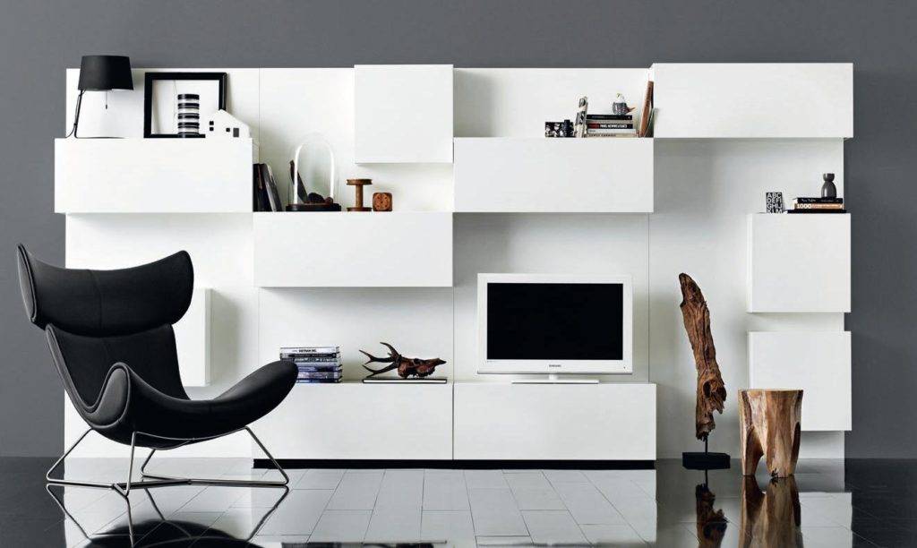 Минималистичные стенки имеют лаконичный дизайн. Как правило, это открытые полки и прямоугольные или квадратные блоки 1, 2 или 3 цветов. Они могут ставиться на пол и вешаться на стену в любом порядке. Это позволяет создавать интерьеры с неповторимой яркой индивидуальностью.