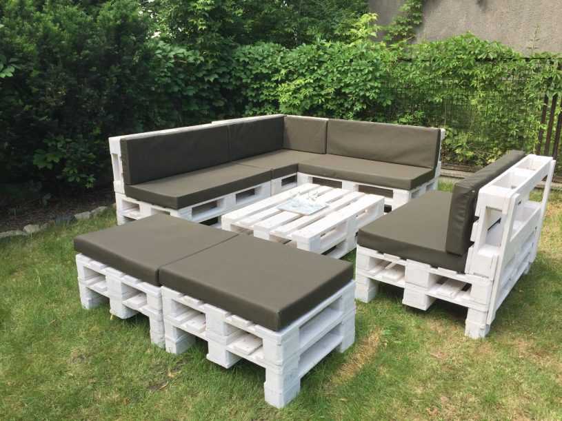 - Диваны и кресла. На них распространяются те же требования по высоте, что и для скамеек. Если говорить о жестких сидениях, то оптимальным вариантом будут три паллеты, стоящие друг на друге. Мягкую садовую мебель дополнительно комплектуют диванными подушками, и в этом случае достаточно двух паллет. Глубина диванов и кресел обычно лежит в пределах от 0.5 м до 1 м, а оптимальным размером считается 80 см. И если из паллет делать эти предметы мебели, то для жестких изделий еще может подойти обрезанный по ширине или длине поддон, а для мягких, с учетом подушек, нужны только целые образцы.