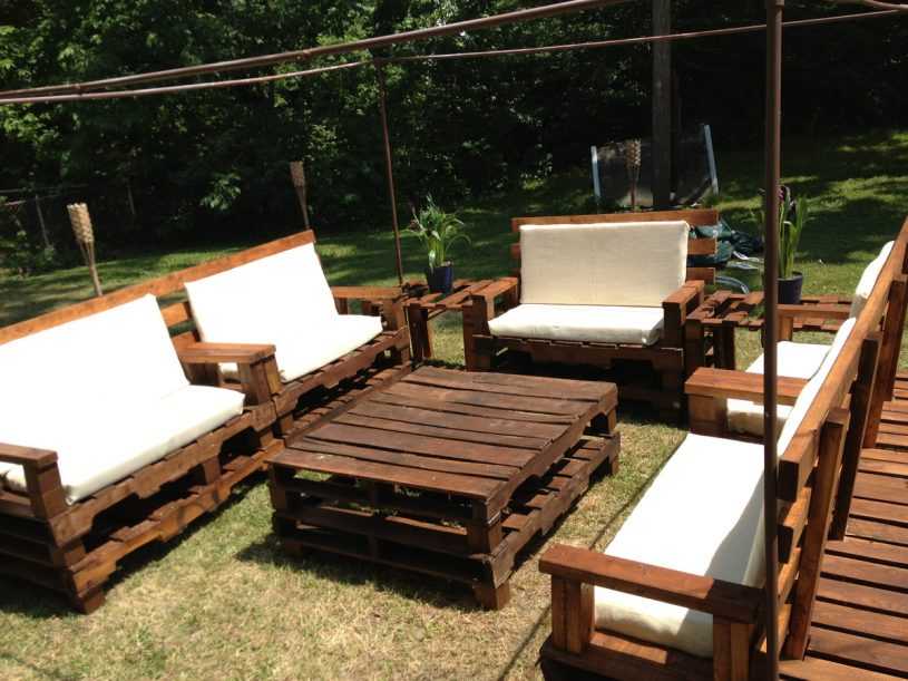 Если вы недавно построили дом, соответственно, лишние затраты пока вам ни к чему, то использование изделий из паллет как временной альтернативы садовой мебели — отличный вариант. Вам не понадобится много времени, стол и два диванчика вы сможете сделать за несколько часов, без сторонней помощи.