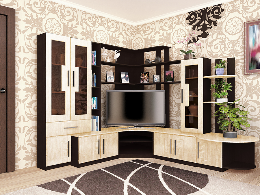 Угловой. Гостиная с рабочим местом, дислоцированном в углу, может быть обустроена при помощи стенки, занимающей части пары смежных стен. Компьютерный либо письменный стол, совмещённый с основной конструкцией, является базовым элементом, от которого расходятся тумбочки, стеллажи, полки и ящики. Боковые части мебели может завершать тумба под телевизор либо платяной шкаф.