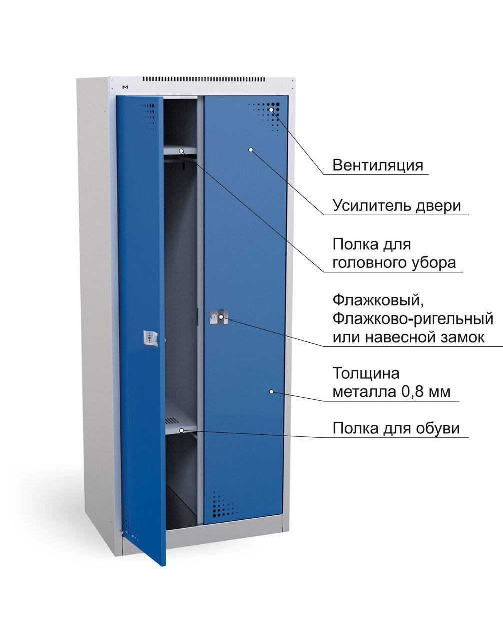Изготавливают такие шкафы из прочного металла. Конструкция представляет собой две одинаковые секции. Каркас составлен из цельносварных труб, на которые крепятся стенки. Дверца надежно запирается на замок. Иногда предусмотрена возможность дополнительной установки навесного запирающего устройства. Это обеспечивает сохранность сменной одежды и ценных вещей сотрудников или посетителей.