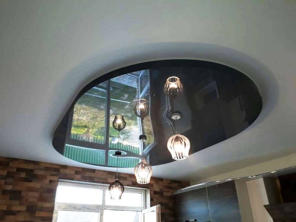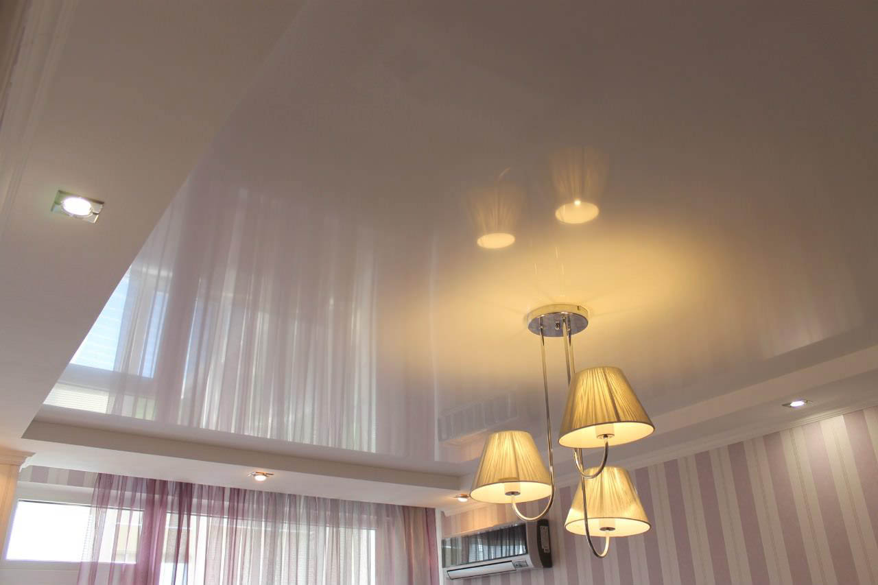 Глянцевый потолок в зале выполняется из пленки ПВХ с отражающим эффектом.