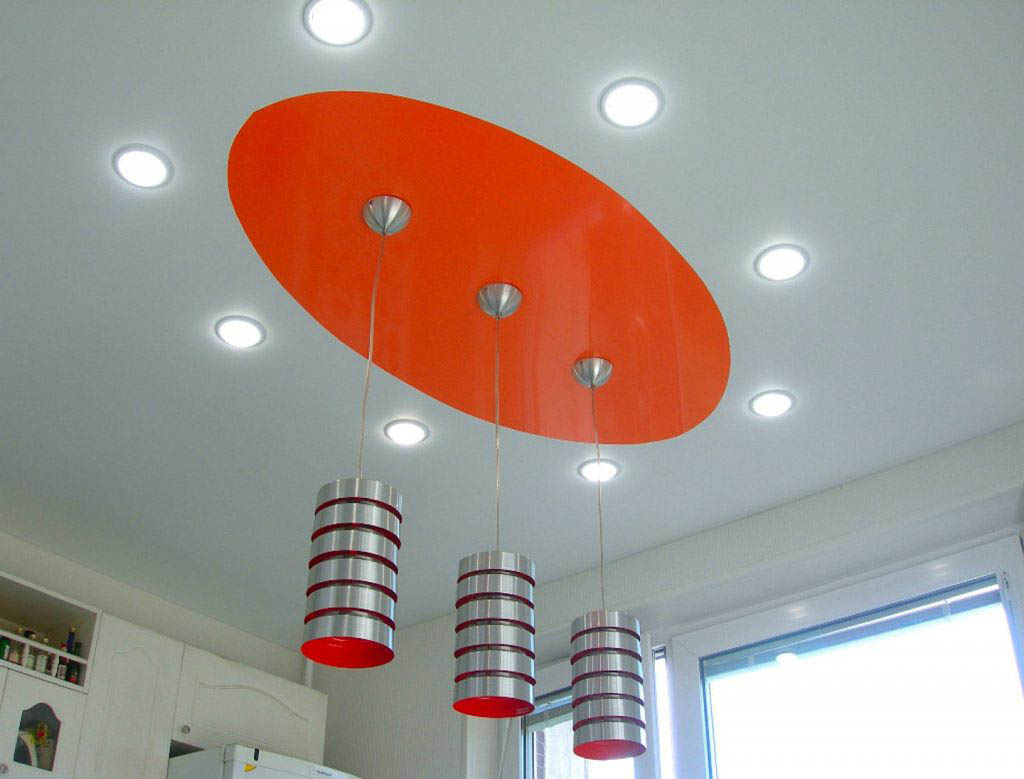 Такой потолок может быть выполнен в различных стилях: классический, абстрактный, восточный и т.д. Отдельного рассмотрения заслуживает многообразие выбора светового оформления. Потолок могут украшать громоздкие лампы, точечные светильники, светодиоды и т.д. Если правильно спланировать схему освещения, комната будет светлой, комфортной и уютной.