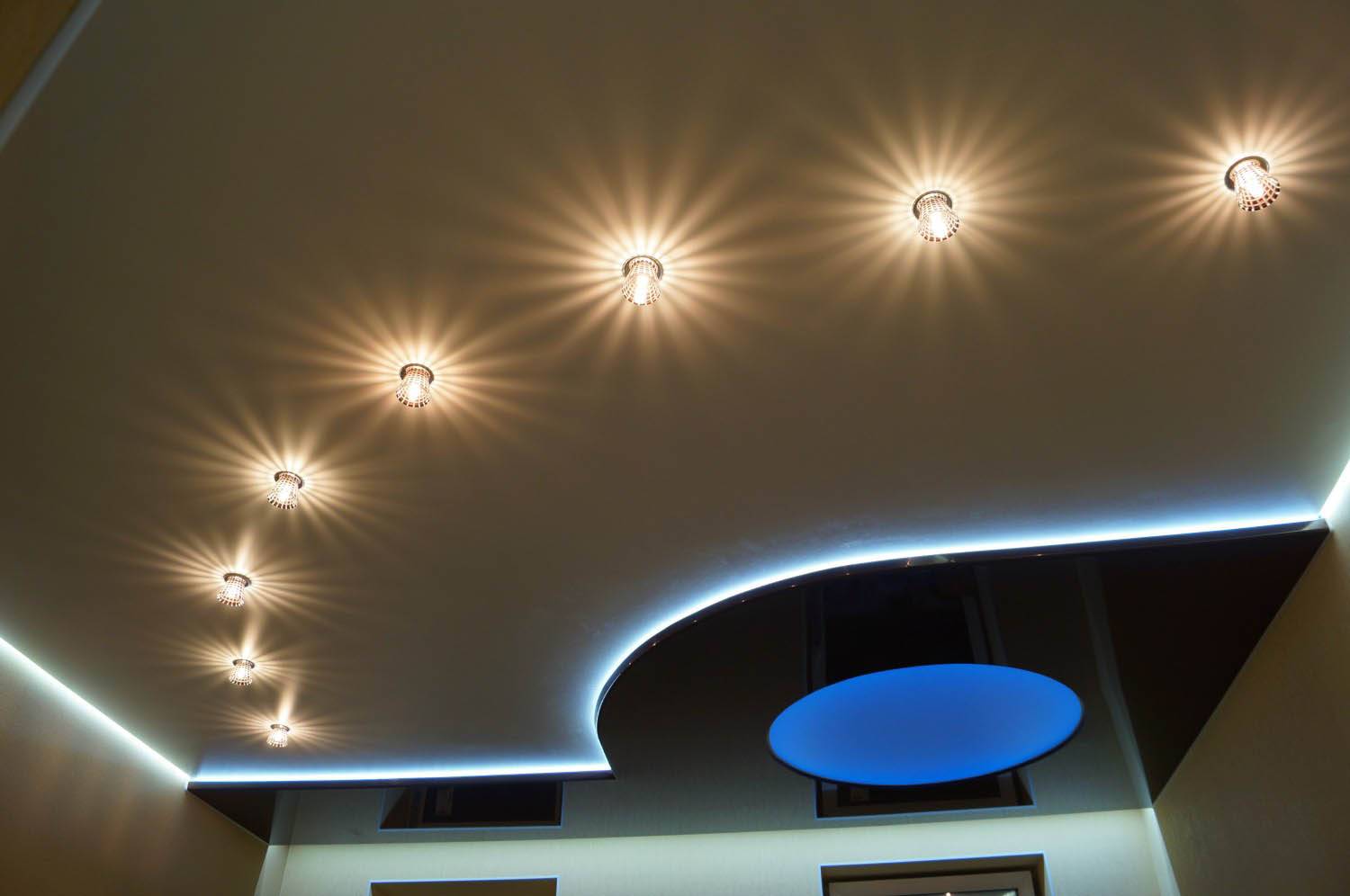 Предлагаем взглянуть на самые интересные способы взаимодействия многоуровневых натяжных конструкций с разными источниками освещения.
