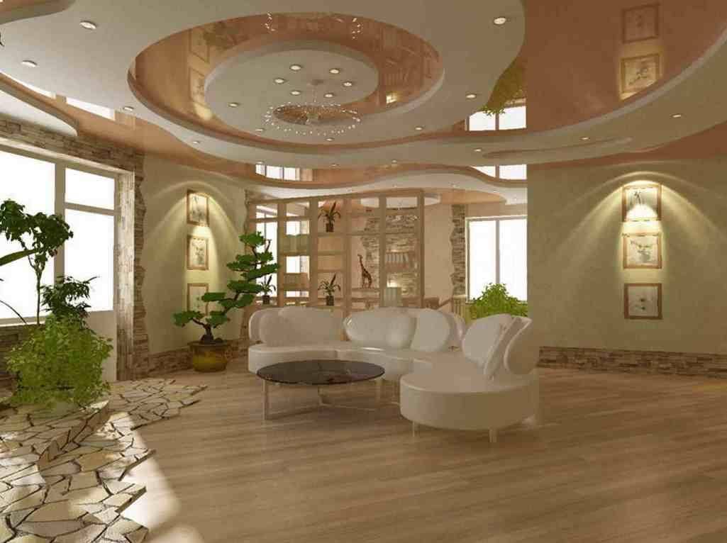 Если хочется чего-то необычного в дизайне зала, то двухуровневый потолок станет отличной идеей! Такая конструкция обладает рядом преимуществ:
