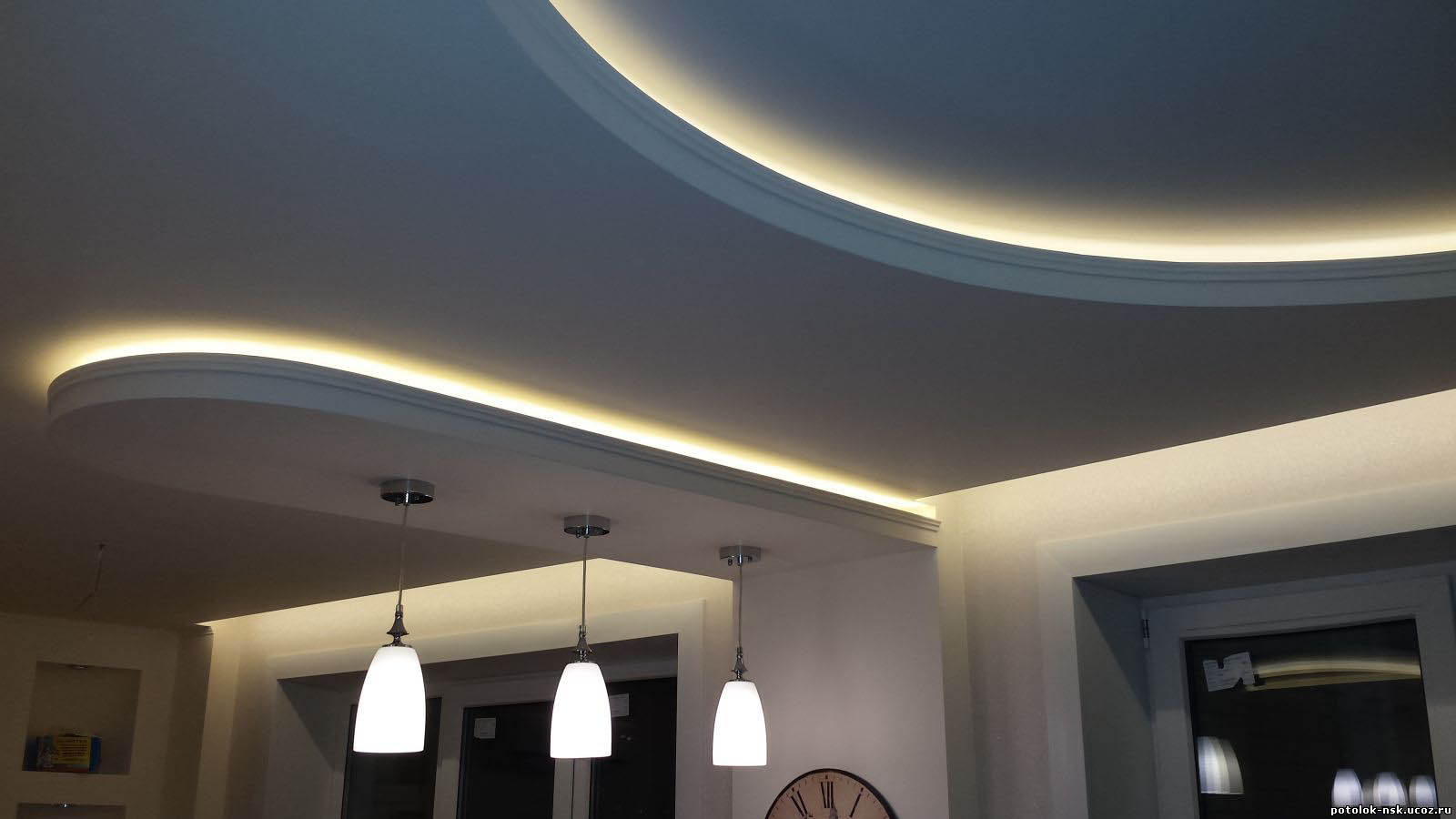 Какой потолок подойдет для кухни, гостиной или прихожей, зависит от габаритов помещения. Решающим фактором при выборе количества уровней станут его высота и площадь. Чем меньше помещение, тем аккуратнее надо моделировать ярусы.