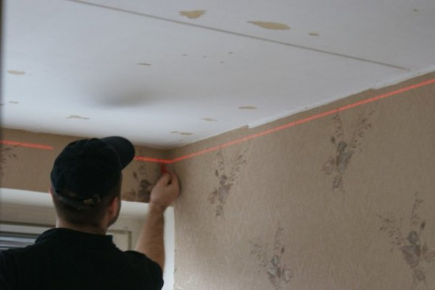 Для начала необходимо провести предварительную подготовку декорируемой поверхности. При выявлении деформаций на потолке, их предварительно устраняют, и только после этого переходят к разметке уровней.