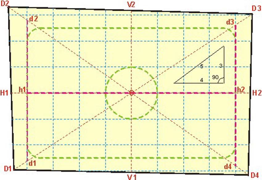 Шнур натереть темным порошком и отбить по диагонали. Провести разметку центра комнаты, компенсировав все неровности потолка и стен. Расчертить линии, продольные скрытым граням второго яруса. Расчертить сетку для подвесов 1 яруса во внутреннем периметре коробов, то есть расставить метки— каждую на 50 см от друг друга по продольным границам обратных двух линий. На остальных линиях расставить точки на 60 см от друг друга. Должен выйти прямой угол по пересеканию всех линий.