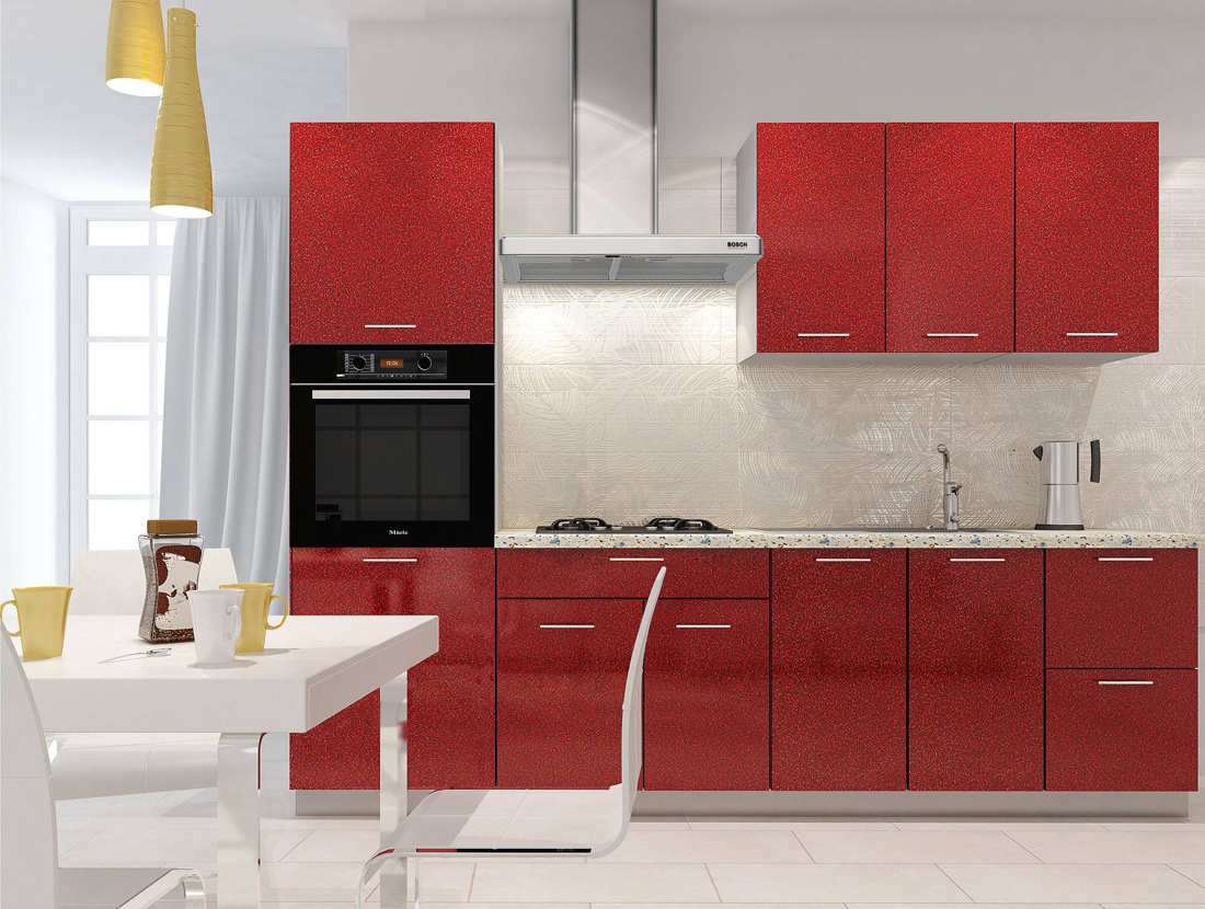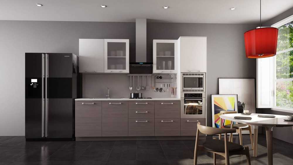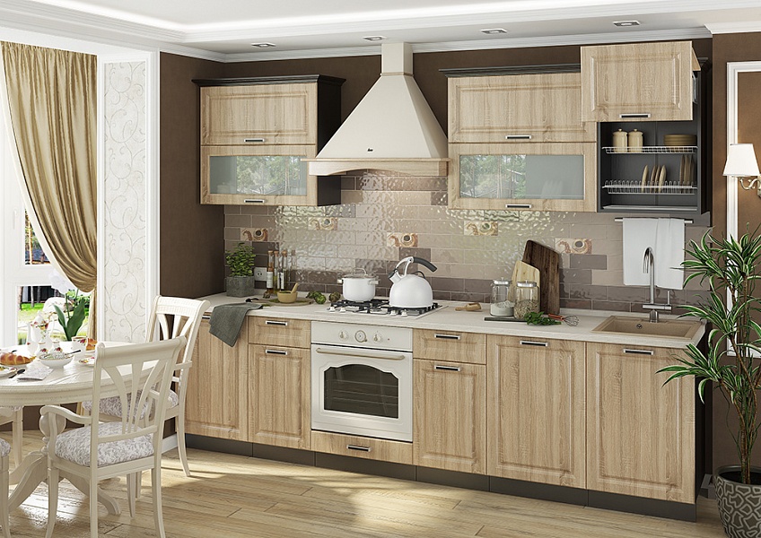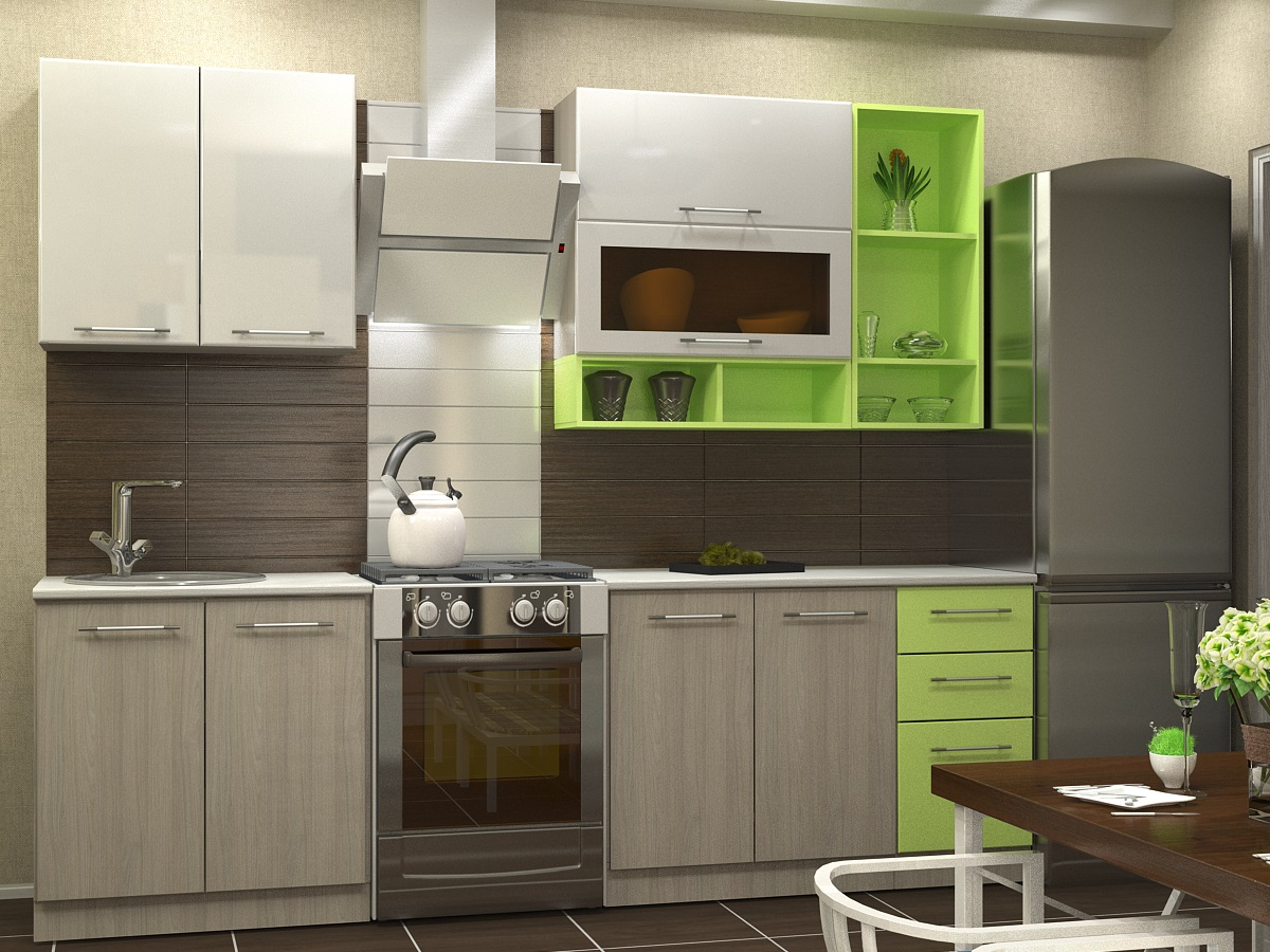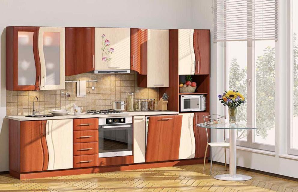 Многие потребители в качестве главного плюса отмечают низкую цену. Линейная вариация гармонично смотрится в прямоугольном помещении. Тумбу и рабочую поверхность устанавливают между раковиной и плитой. Посуду можно хранить в подвесных шкафах и напольной тумбе.