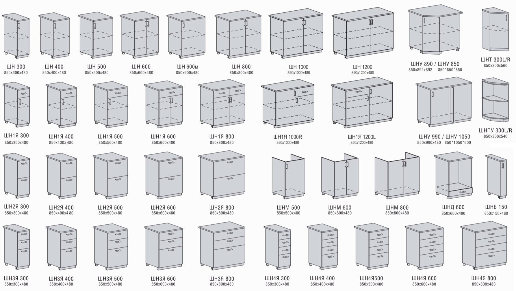 В первом случае шкафчики могут предназначаться для ровной стены или углового помещения. Если это стандартные секции, то отличаются они друг от друга: