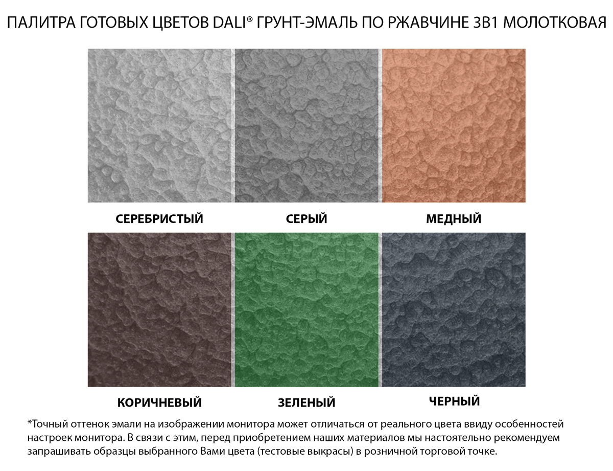 Молотковые красители служат в первую очередь для защиты, а не декора, поэтому изначально выпускались в черном и сером цвете. Рынок диктует свои условия и производители начали включать цветные пигменты в состав материала, что расширило цветовую палитру.