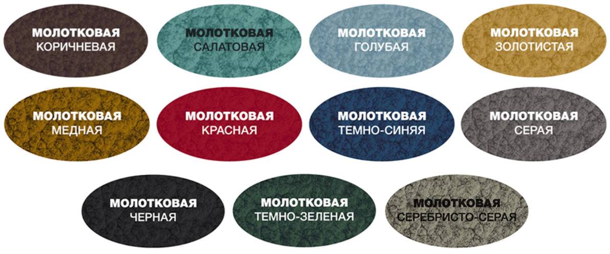 Молотковые красители служат в первую очередь для защиты, а не декора, поэтому изначально выпускались в черном и сером цвете. Рынок диктует свои условия и производители начали включать цветные пигменты в состав материала, что расширило цветовую палитру.