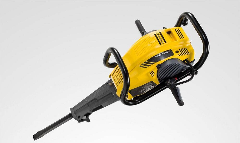 - Бензиновые устройства приводятся ДВС, у которого отсутствуют клапаны и вал. При невысокой мощности основным преимуществом данных вариантов является автономность, то есть возможность применения в любом месте. Это обусловлено отсутствием необходимости подключения к источнику энергии. Длительность работы определяется только количеством топлива. К тому же отбойные молотки этого типа считают более безопасными в сравнении с аналогами. При этом они отличаются высоким уровнем шума. Данные модели применяют в добывающей промышленности, при разрушении бетона, асфальта, промерзшего грунта.