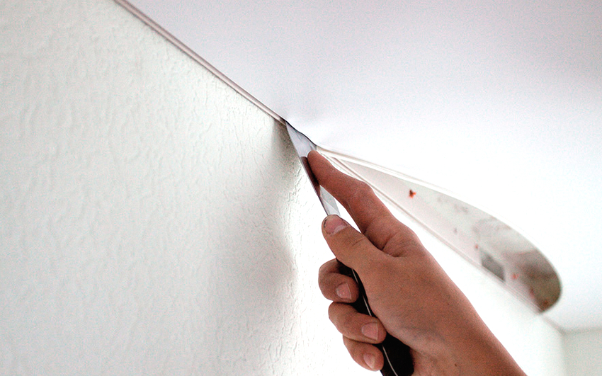 - Используя лопатку-шпатель, завести полотно в углы в профиль, предварительно сняв с подвесов.