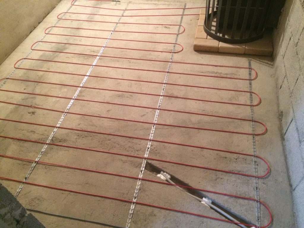 Требующееся для застывания бетонного раствора время придётся потратить на разработку схемы укладки тёплого пола под плитку