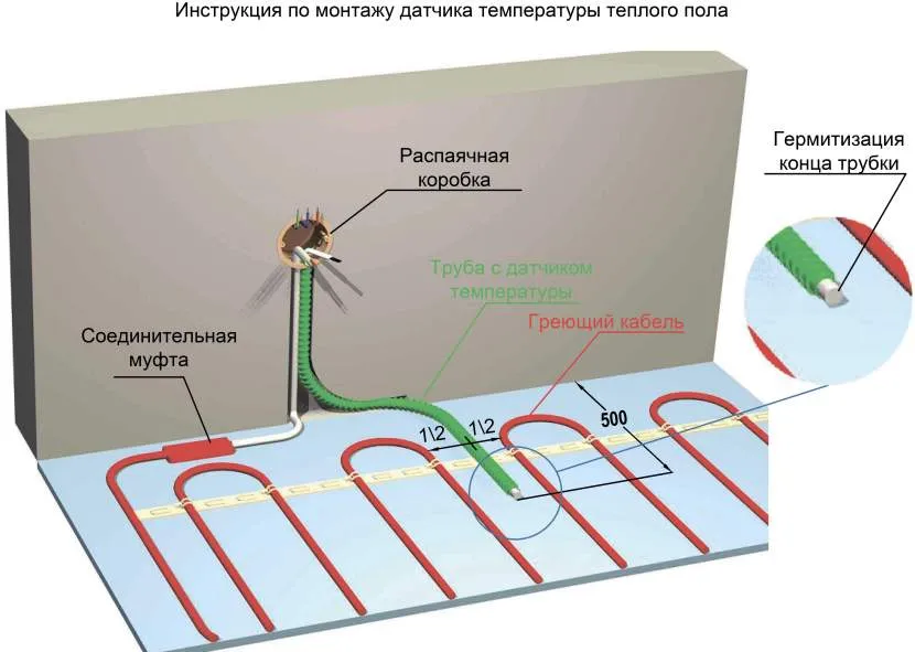 Его монтаж выполняется на полу. Обычно расстояние от него до стены с термостатом составляет 500 мм. Монтируется датчик и его провода к терморегулятору в углублении, которое делают в теплоизоляции. При этом для защиты используется гофрированная трубка.