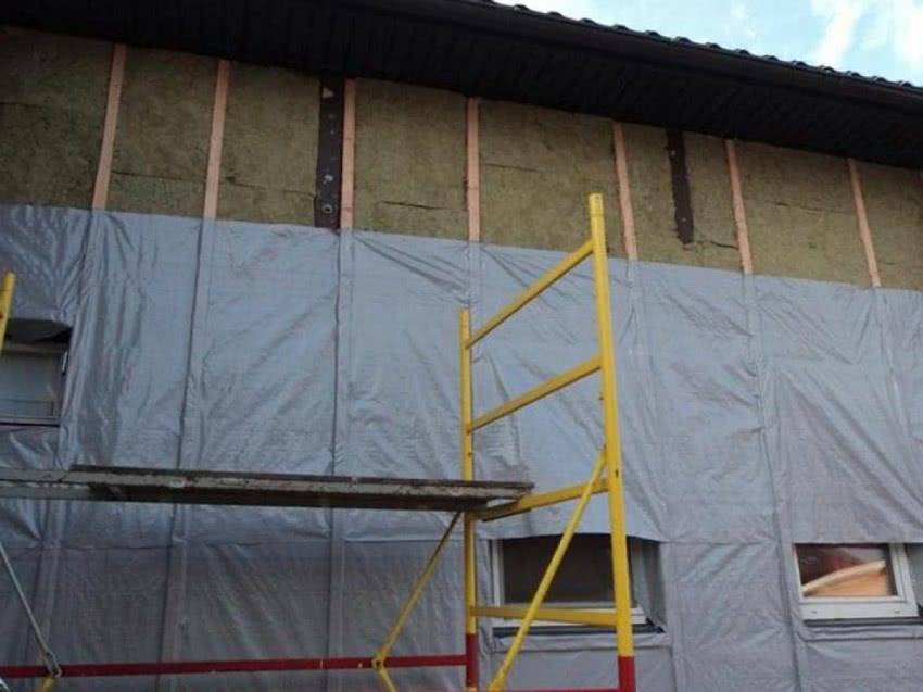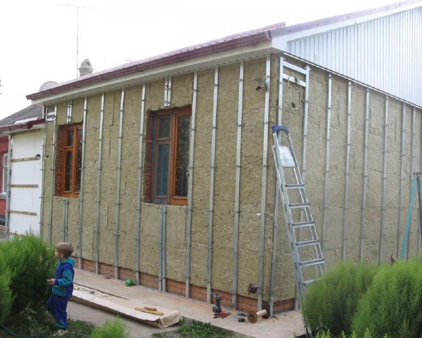 Маты приклеивают к стене, затем застилают паропроницаемой гидроизолирующей плёнкой и окончательно фиксируют профилями каркаса.