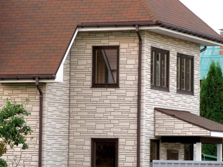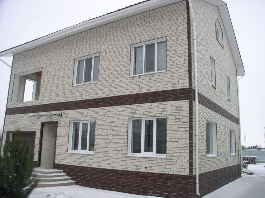 Панели имитируют различные породы природного камня или кирпичную кладку и имеют форму плит размерами около 1000х500 мм. Панели стоят дороже реечного сайдинга (от 650 рублей за квадратный метр), их монтаж сложнее, но вполне по силам человеку, разбирающемуся в строительстве. Комбинируя различные виды сайдинга можно отделать дом в любом стиле и превратить невзрачное здание в изящный коттедж.