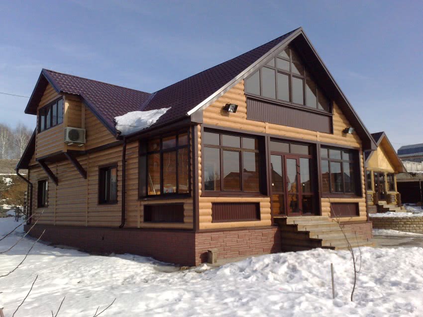 - выигрышно может смотреться и смешение стилей. Например, стены можно обшить досками, а углы и балкончики выложить кирпичной или каменной кладкой. Фасад такого дома получится солидным и респектабельным;