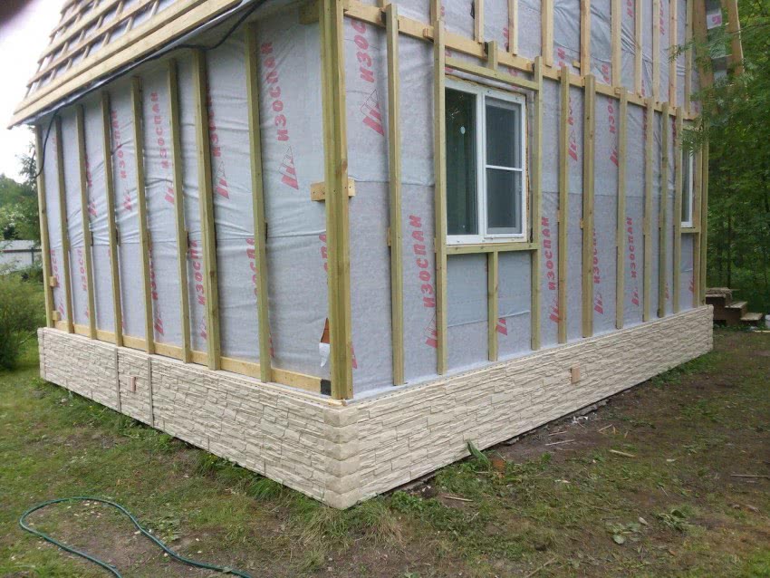 Закрепляют на стене деревянный каркас, бруски которого располагают параллельно с панелями сайдинга. То есть, если предполагается горизонтальный монтаж облицовки, то и деревянный каркас для утеплителя следует устанавливать горизонтально. Шаг между брусками должен быть равным ширине плит теплоизолятора, а высота брусков — толщине этих плит. Плиты теплоизолятора укладываются между элементами каркаса. Для удобства их можно прихватить клеем. Сверху утеплитель застилается гидроизоляционной плёнкой, которая пришивается к каркасу строительным степлером