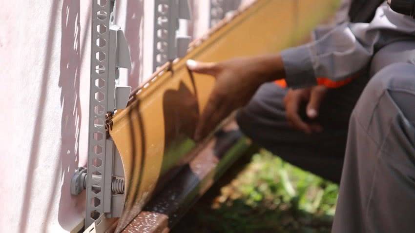 - Устанавливая сайдинг, направляйте свои усилия строго снизу вверх. Давите на плашку до тех пор, пока части замка не соединятся надежно.