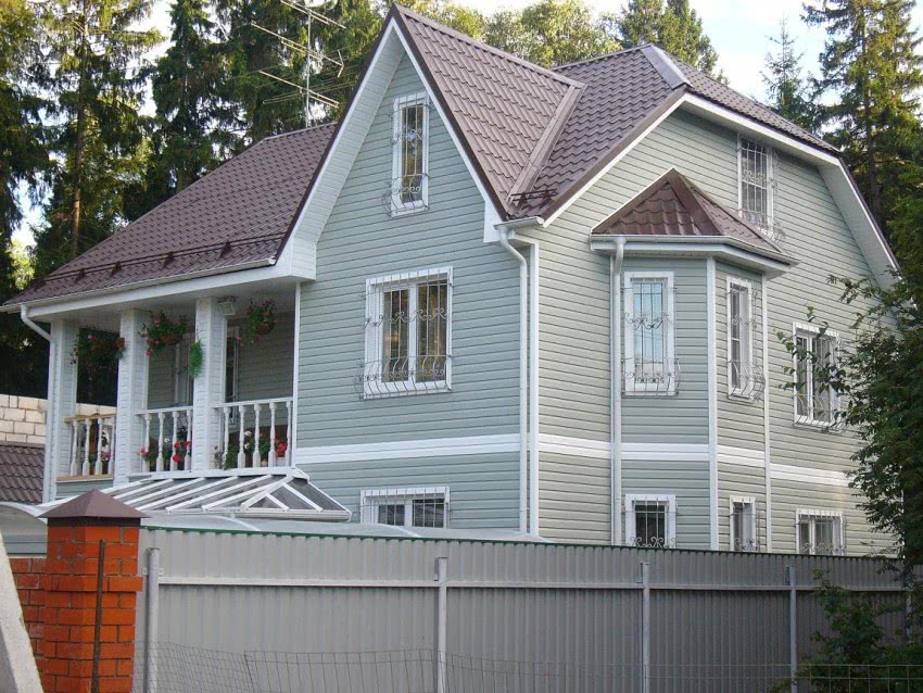 Крыша дома выполняется из металлочерепицы или мягкой кровли, поэтому при подборе фасадной отделки необходимо учитывать общее сочетание цветов.