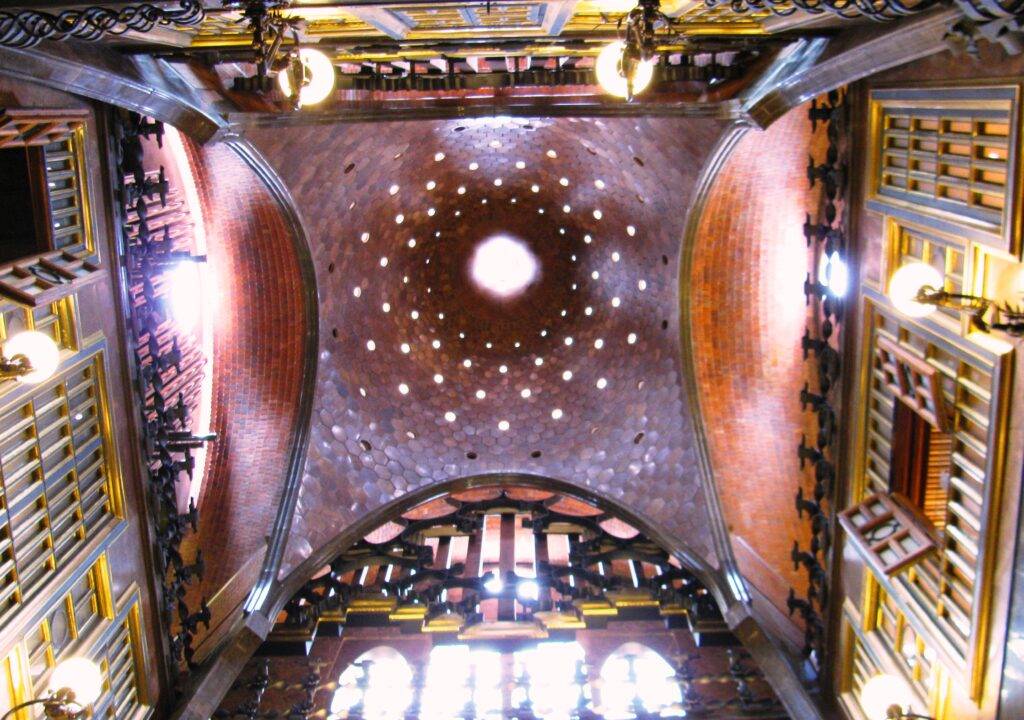 Потолки – ещё одна особенность стиля Гауди. Кажется, что он не перестаёт изобретать различные перекрытия и весь предыдущий архитектурный опыт – лишь скучная “база” для его экспериментов. Даже любимые архитектором кессонированные потолки каждый раз разные. То они украшены в шестигранниках изящной резьбой, то конструктивно разделены на ромбы или квадраты и единственным украшением служат металлические накладки.