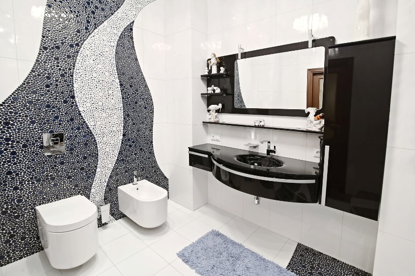 Выбирая мозаику в ванную комнату, стоит также запомнить, что она производится из различных материалов. Каждый из них имеет свои особенности. С помощью такой облицовки можно оформить не только вертикальные и горизонтальные поверхности помещения, но и отдельные элементы интерьера.