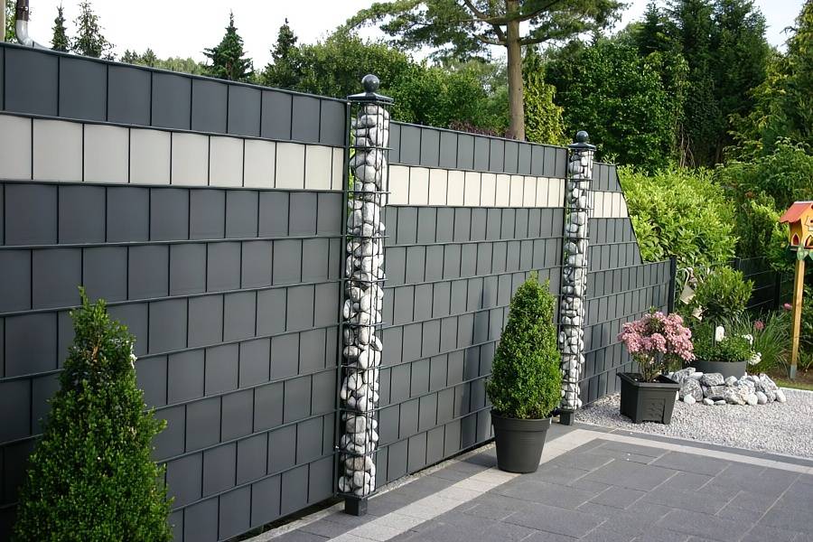 Светло-серые профлисты будут прекрасно смотреться с габионами или пергонами.