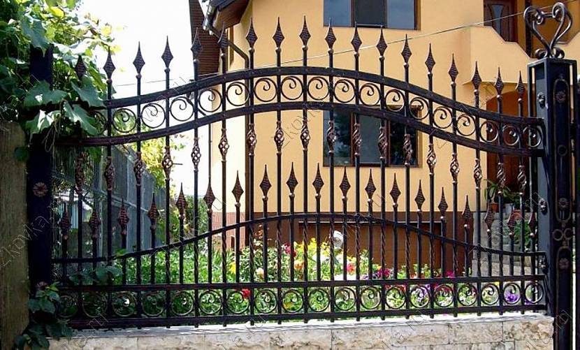 - Железо. Железные изделия – довольно дорогой вариант. Но это, пожалуй, их единственный недостаток. Прослужат они очень долго, смотрятся шикарно, особенно в загородных домах и ухоженными дворами. Особенно выигрышно будут смотреться в сочетании с кирпичными столбами и фундаментом.
