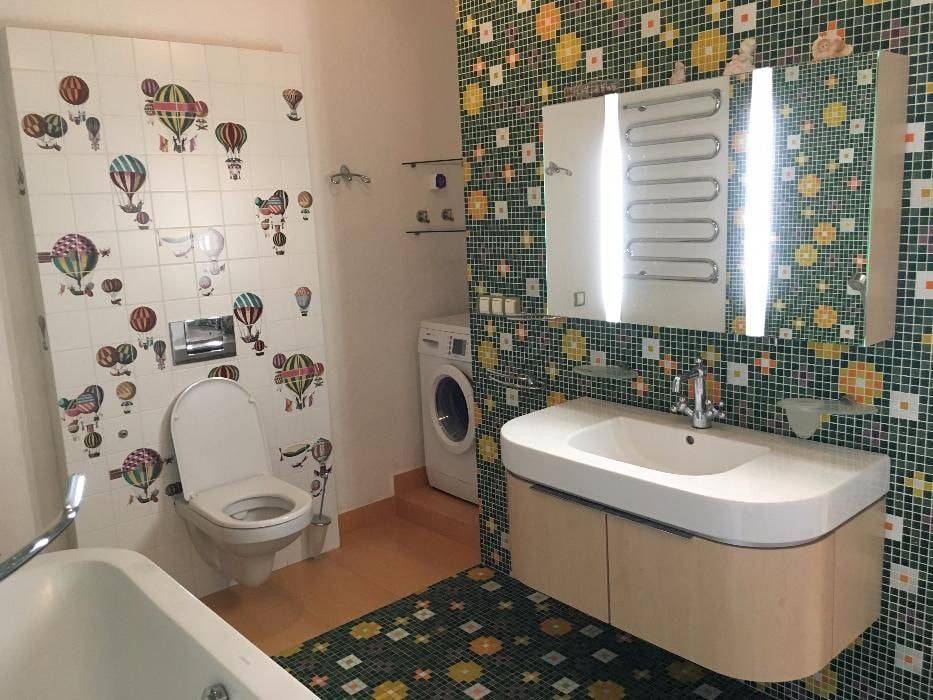 Большой простор для фантазии. С помощью мозаики можно выполнить отдельные элементы, сочетая мелкие плиточки, образующие узор, с керамической плиткой, обоями. Это может быть бордюр с рыбками, ракушками либо панно, являющееся ярким цветовым акцентом на однотонной стене.
