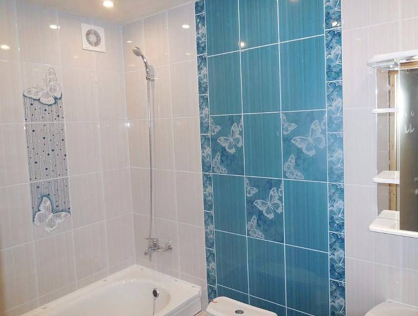 Очень часто для оформления ванной выбирают голубой цвет, цвет воды, поэтому популярными являются рисунки с изображением обитателей подводного мира, морских просторов – дельфины, чайки, парусники. Необычно и эффектно – сочетание голубой плитки с отделкой из мелкой гальки. Красиво смотрятся сюжеты, имитирующие водный поток, стекающий со стены на пол.