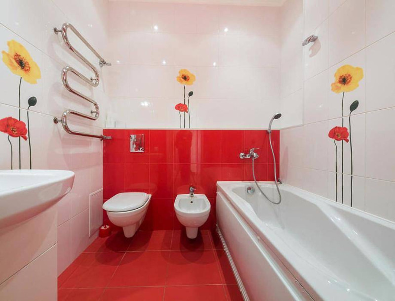 Чтобы разбавить однотонность интерьера, добавляются аксессуары красных оттенков. Это может быть вставка из керамической плитки, полотенца, напольный коврик.
