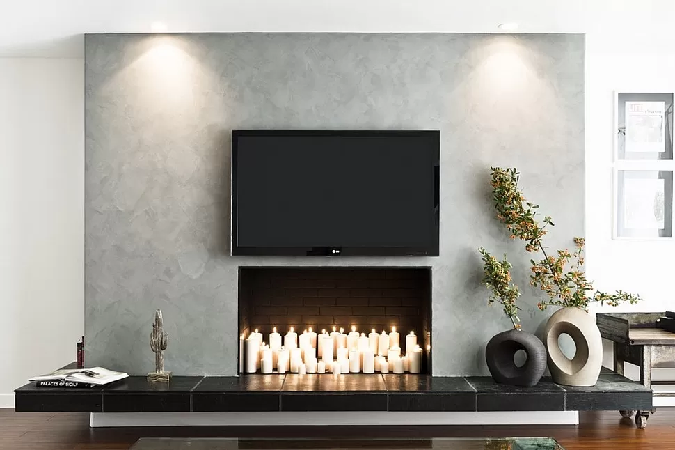 Для создания красивого камина можно воспользоваться готовыми идеями. Эффектно смотрится декоративный камин, фактура которого напоминает натуральный. При этом нужно использовать закрытый тип топки и декоративные детали в виде свечей.
