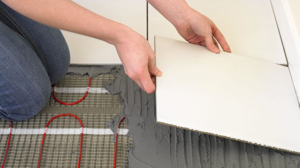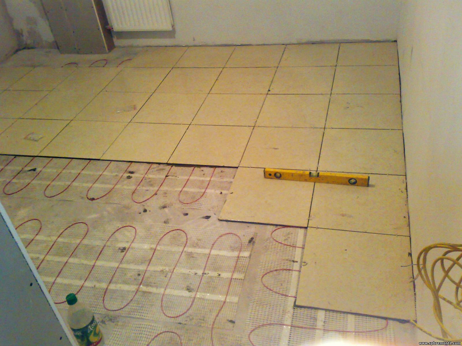 Укладка кафельной плитки на тёплый пол не имеет особенных отличий от укладки плитки на любую другую поверхность. Однако, чтобы не повредить нагревательные элементы, маты тёплого пола рекомендовано залить стяжкой из плиточного клея.