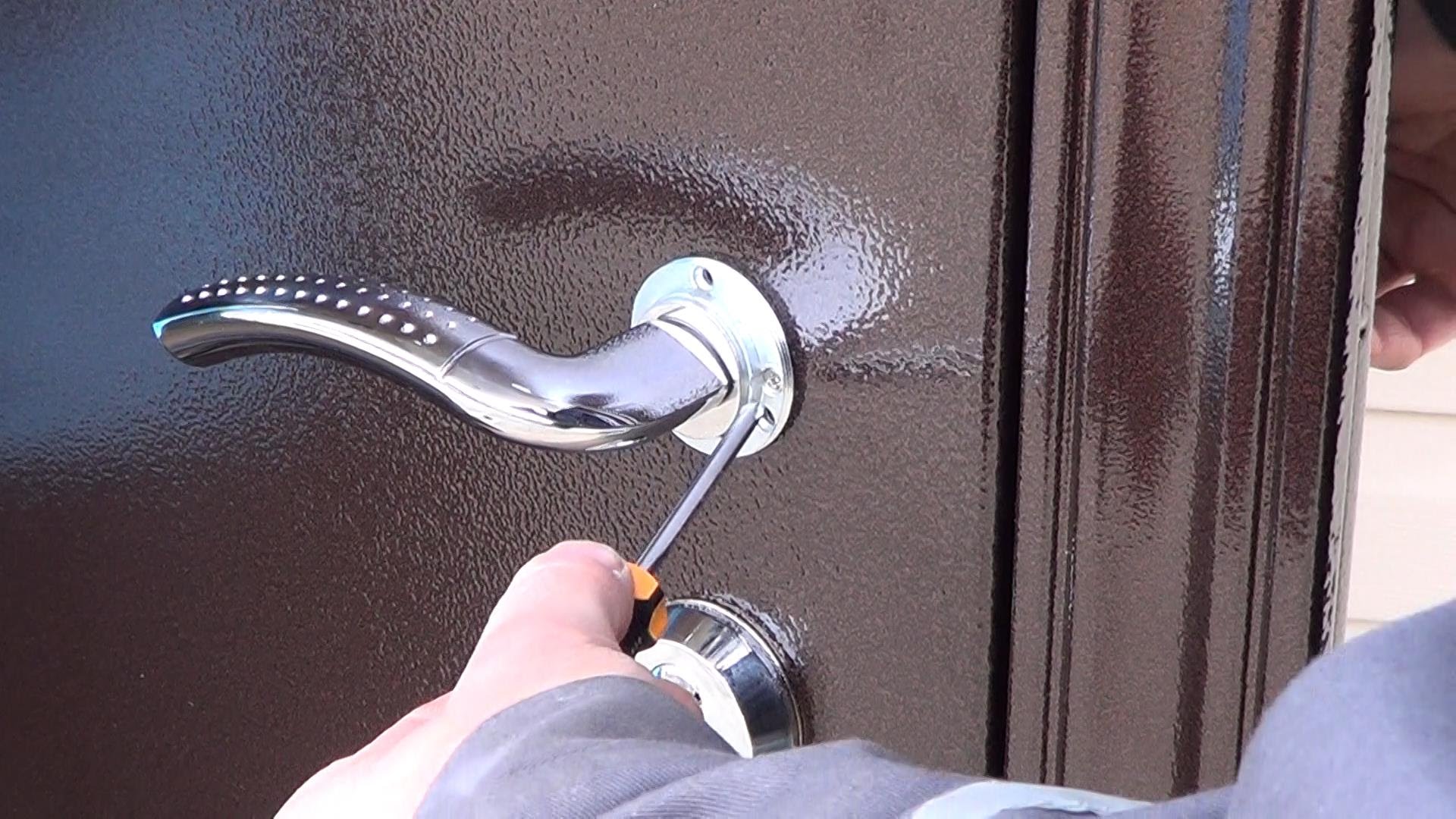 - открывают входную дверь, прикладывают декоративную накладку и фиксируют ее.