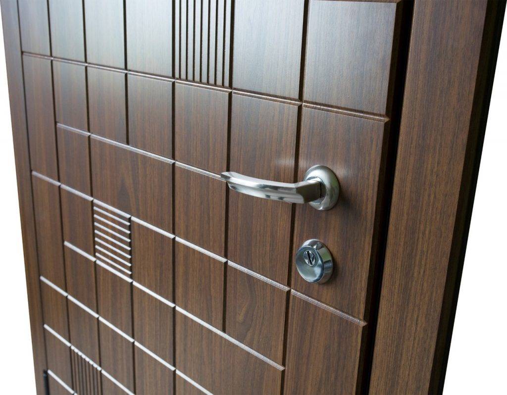 В многоквартирных домах входные двери не подвергаются столь жестким погодным испытаниям, поэтому накладки ламинируются обычной ПВХ пленкой.