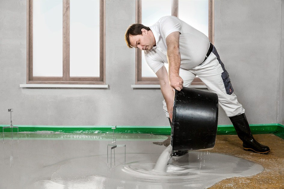 Шаг 4. Состав выливается на поверхность пола. Смесь имеет хорошую растекаемость и не потребует значительных усилий для разравнивания.
