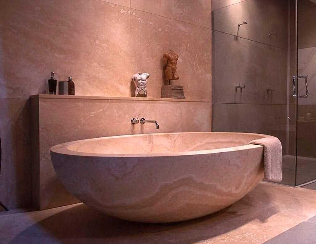 Если позволяет бюджет, ванна из цельного куска мрамора или травертина станет главной достопримечательностью дома, вокруг которой можно выстроить все остальные детали.