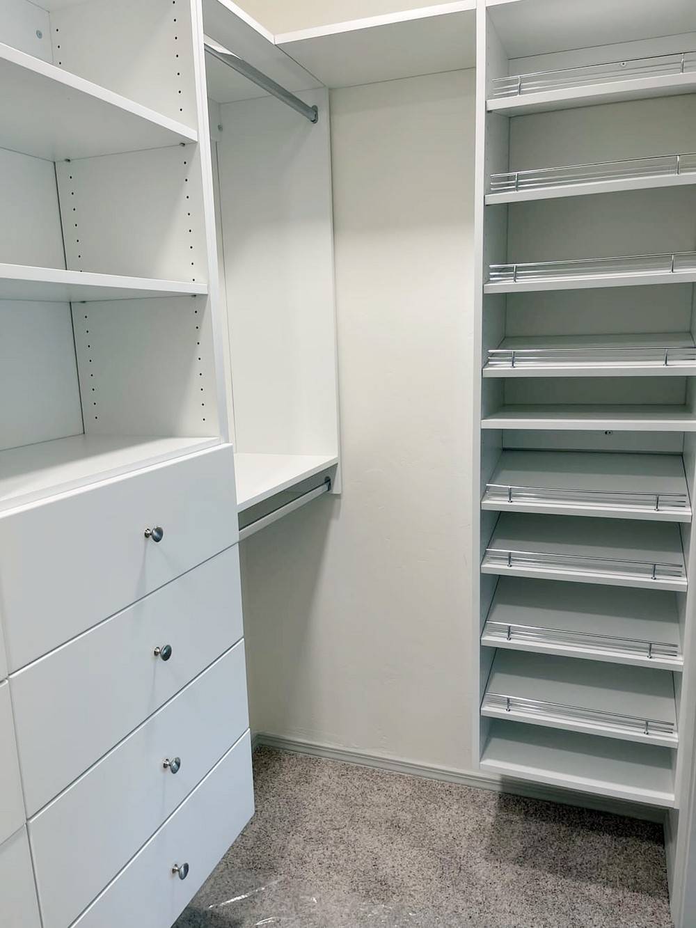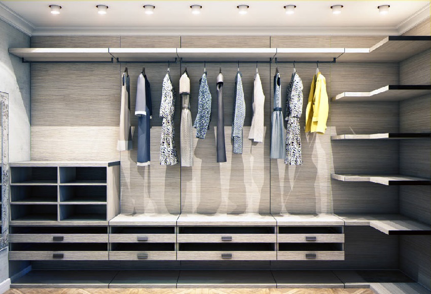 Каркас и полки стеллажей выбирают под цвет стены, чтобы вся конструкция сливалась. Планировка – свободная, мобильная, что делает маленькие гардеробные комнаты в кладовках вместительными.